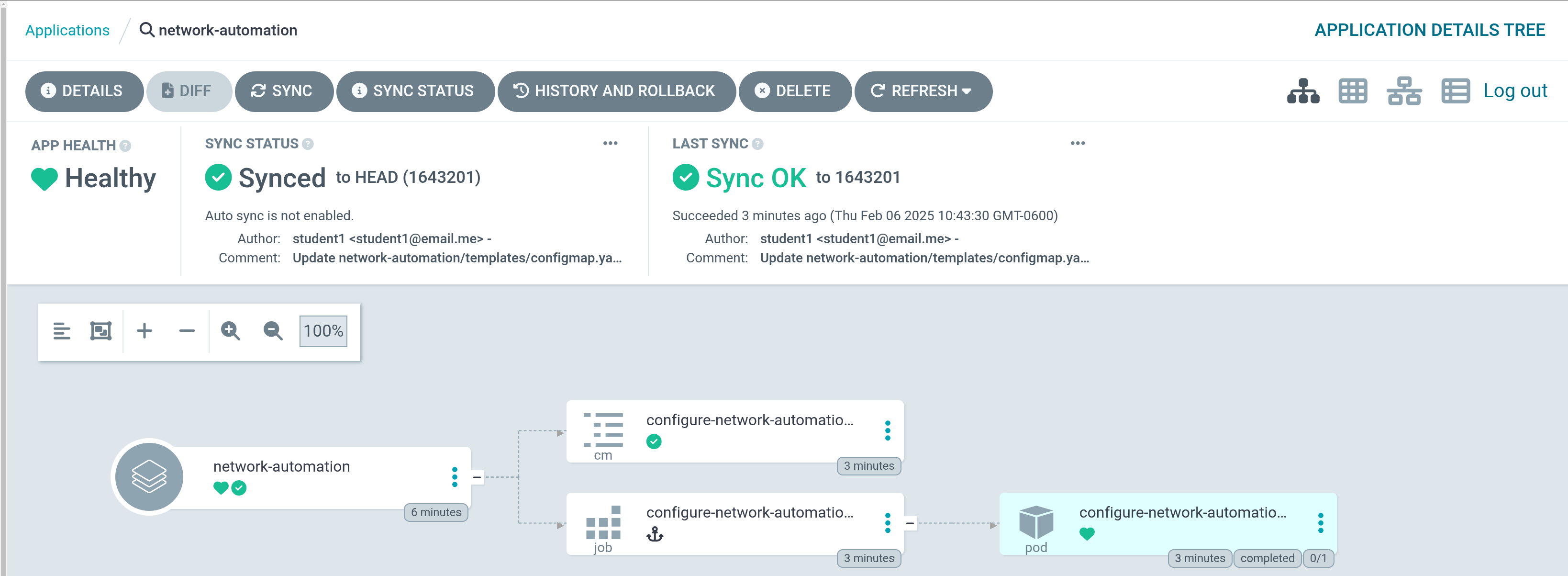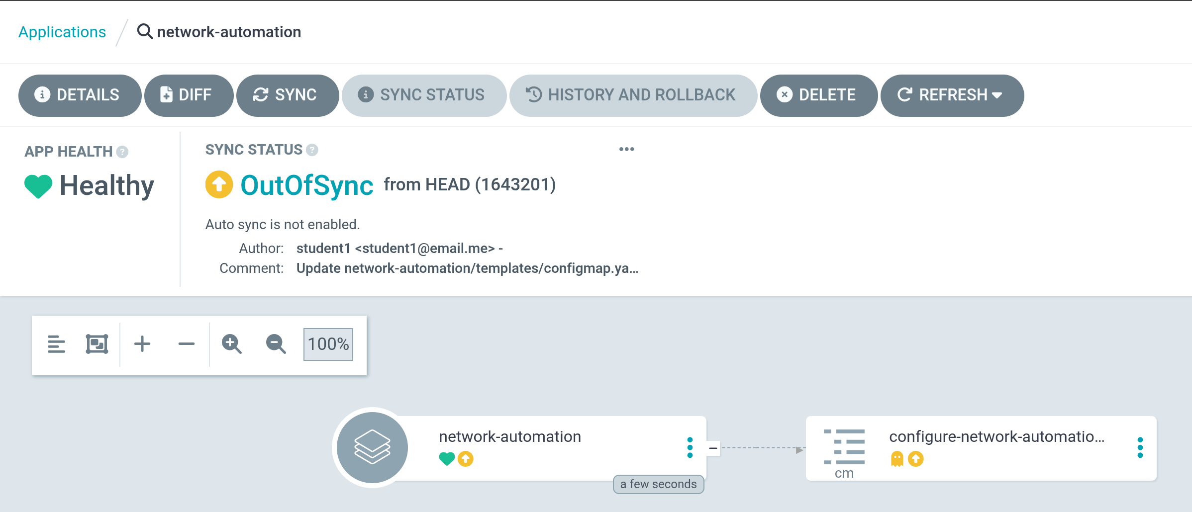 As discussed previously, our helm templates have been rendered, showing our configmap. Our job won’t appear until we hit the Sync button in the next step.